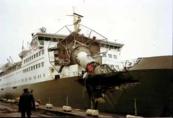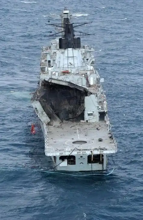 Британский линейный корабль HMS King George V после столкновения с британским же эсминцем HMS Punjabi