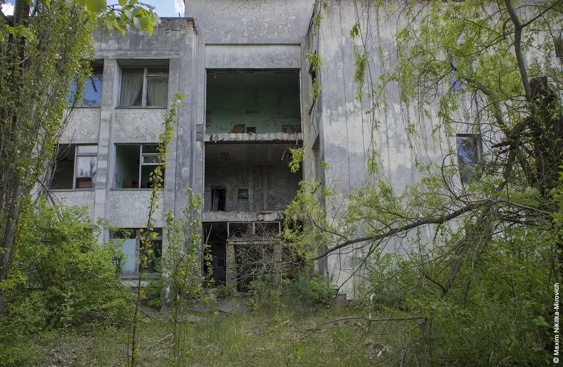 Здание рыбной фермы недалеко от Четвертого энергоблока; она функционировала как научная база примерно до начала 2000-х годов. Как видим, здесь уже тоже все растащено.