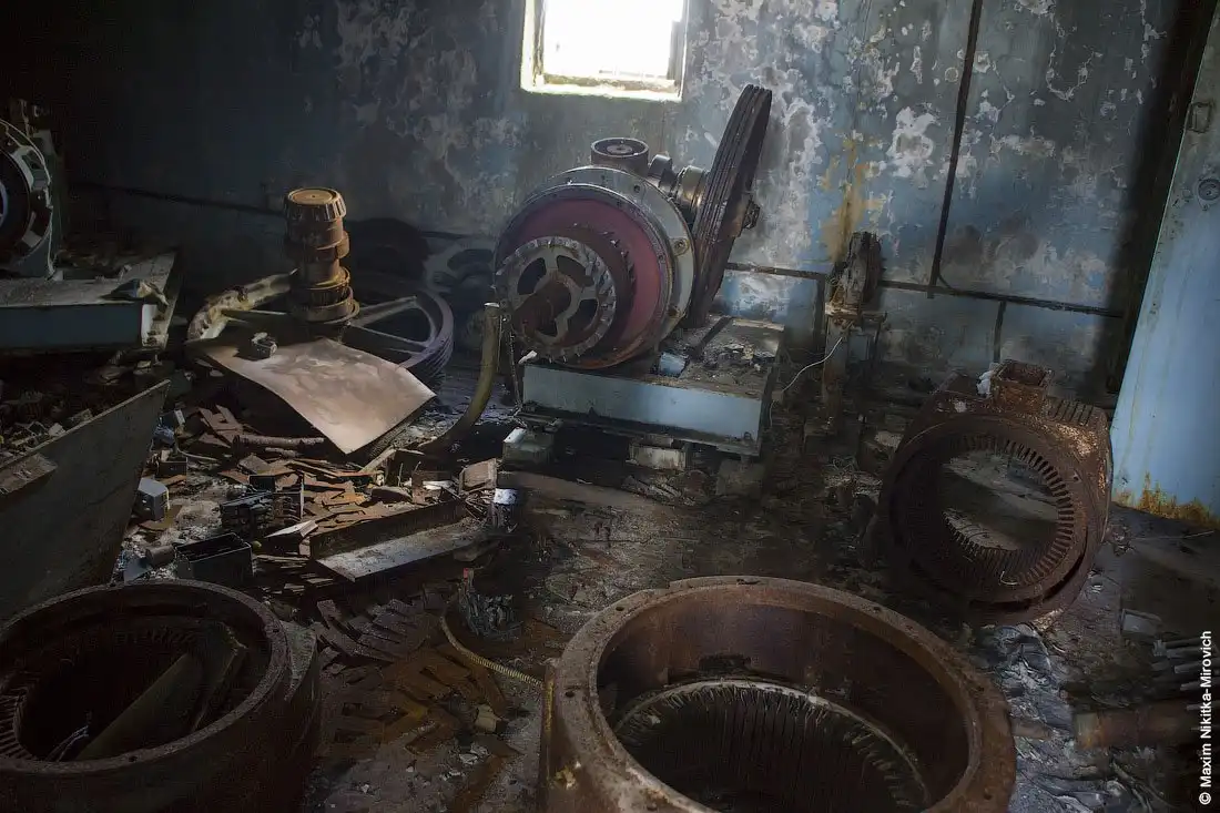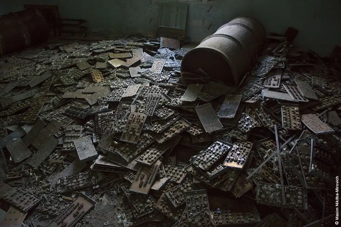 Внутри помещений встречаются целые комнаты, заполненные электрическими платами, с которых, видимо, снимали какие-то ценные детали, содержащие золото и платину.