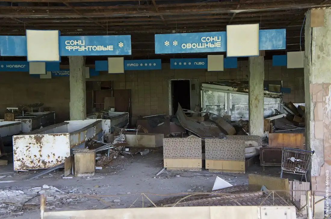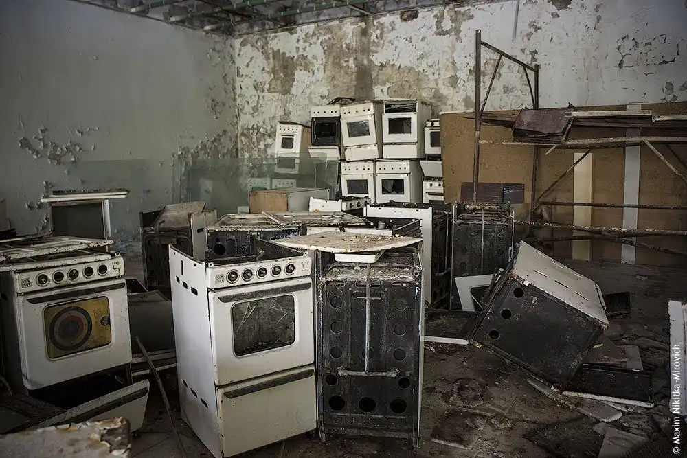 Для предотвращения краж часть бытовой техники в Припяти свезли в огромные помещения центрального магазина "Радуга". Магазин был под сигнализацией примерно до конца девяностых годов. Сейчас все вещи в магазине уже никому не нужны и мародерам неинтересны — время сделало свое дело.