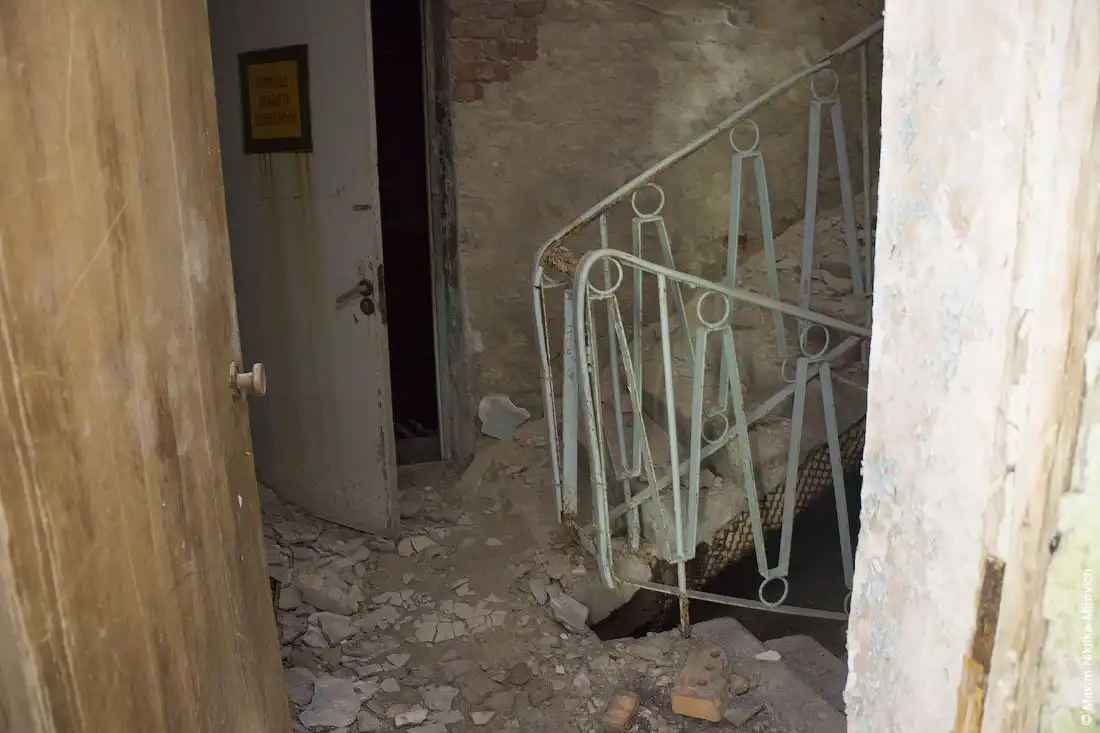 Остатки разбитой плиты, какого-то раскуроченного электроприбора, вытащенные шкафы и кресла. С пола украли даже несколько квадратных метров плитки. Еще на некоторых этажах валяются срезанные части сантехнических труб — видимо, с них свинчивали медные краны.