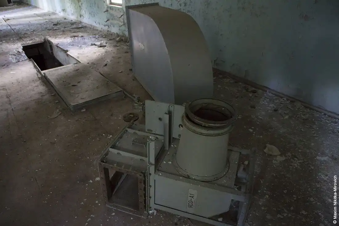 Демонтированный мотор принудительной вентиляции и угловое колено венткороба — а вот это уже совершенно точно дело рук мародеров — сбили с потолка и раскурочили.