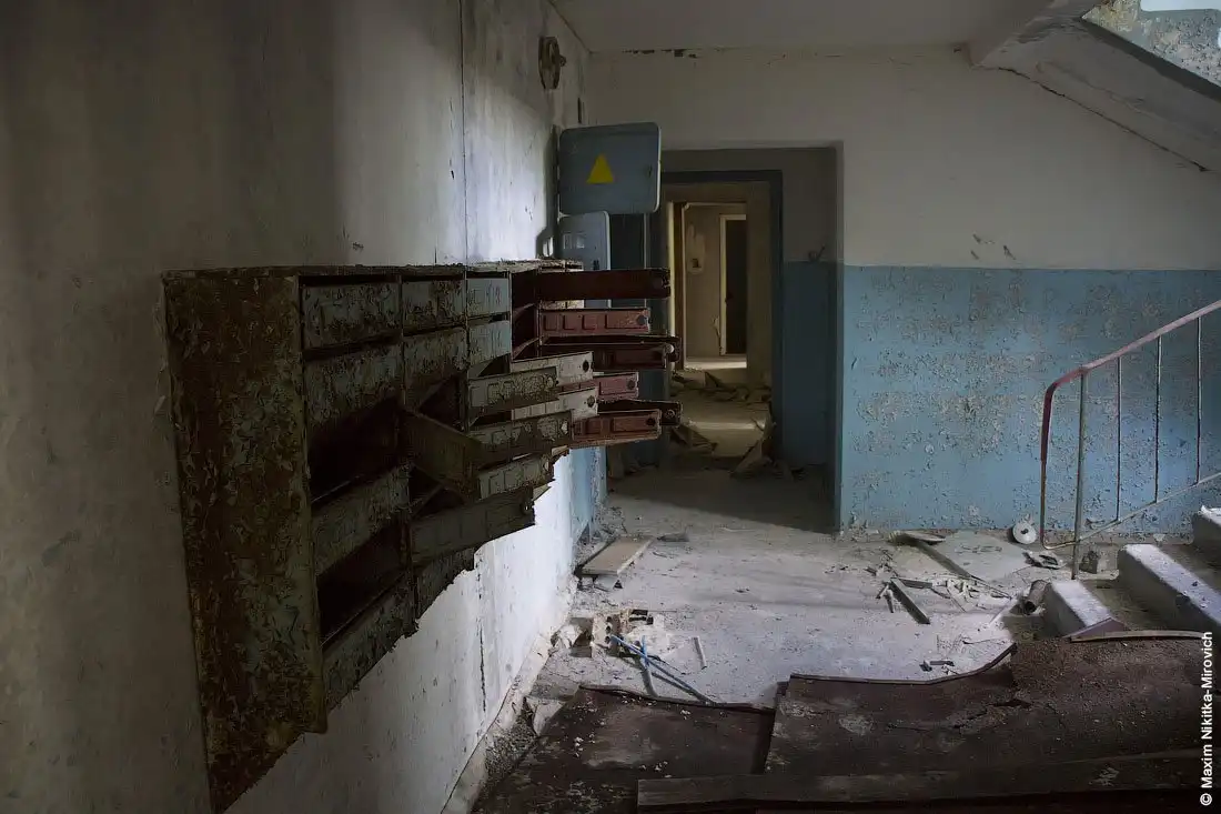 Заглянем теперь внутрь жилых домов. Типичный припятский подъезд выглядит вот так. Все почтовые ящики вскрыты, из всех электрических коробок давно украдено все оборудование. В таком состоянии подъезды были уже к концу девяностых годов — в немецком видеофильме про Припять 1999 года электрические коробки уже разломаны.