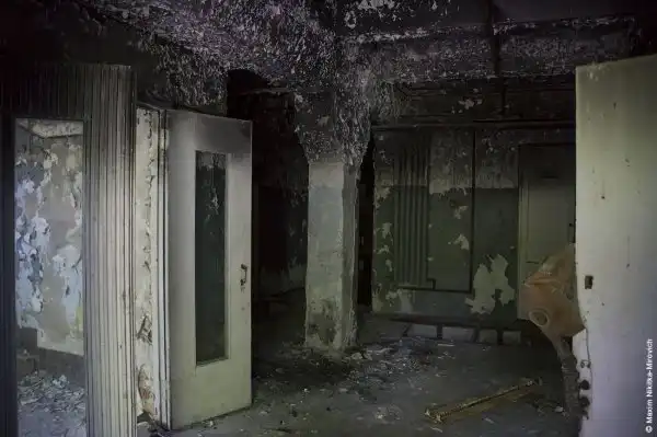 Здание казарм. Вот этот черный потолок — это те же следы костров из проводов, что и в припятских подъездах.
