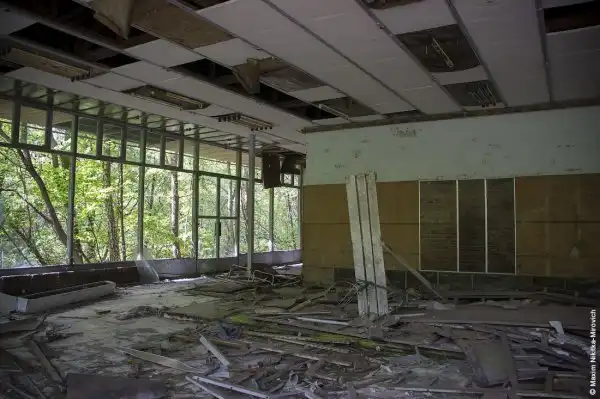 Кафе "Припять" на набережной города. Здесь видны следы не просто мародерства, но и настоящего вандализма — перевернутые барные стойки, разбитые остатки плит на кухне. Кафе кто-то просто доламывал.