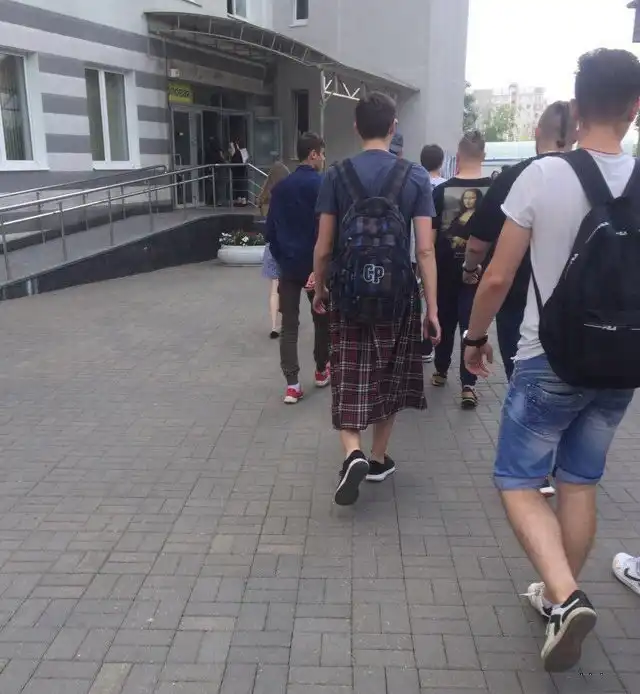 Администрация одного из белорусских учебных заведений запретила парням приходить на занятия в шортах в жаркую летнюю погоду. Это не расстроило креативных студентов, ведь теперь они вышли на занятия в... юбках. После этого администрация все-таки смилостивилась и уже официально разрешила приходить на занятия в шортах.