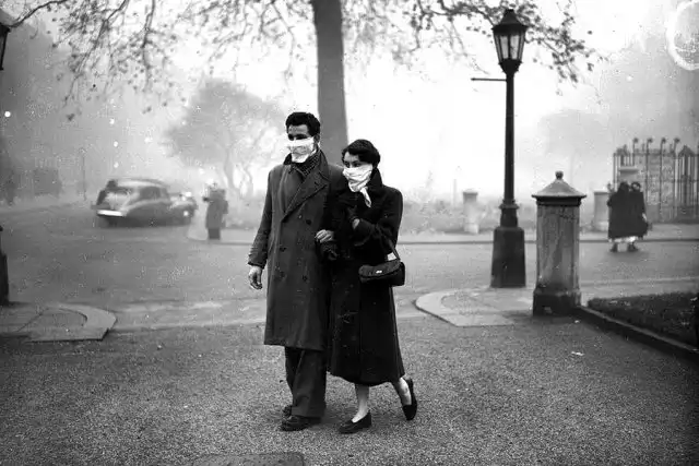 Молодая пара в масках из марли во время Великого смога, из-за которого погибло более 12 тысяч англичан, Лондон, 1952 год