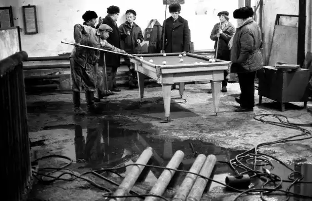 Партия в бильярд во время обеденного перерыва в механической мастерской Запсибгеологии, Новокузнецк, 1983 год