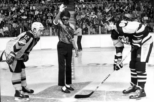 Майкл Джексон проводит вбрасывание в игре между Ванкувер Кэнакс и Питтсбург Пингвинз, Канада, 1984 год