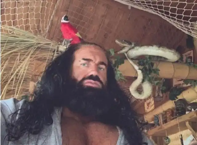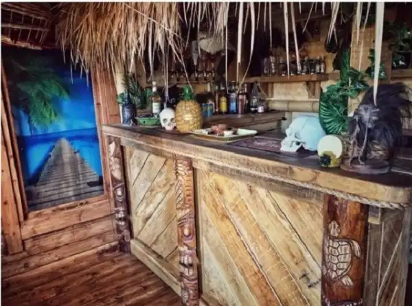 Мост ведет к бунгало, которое раньше было обыкновенным сараем. Для аутентичности стиля гавайцев он использовал кровлю из сухой травы и экзотические украшения, а также установил бар.