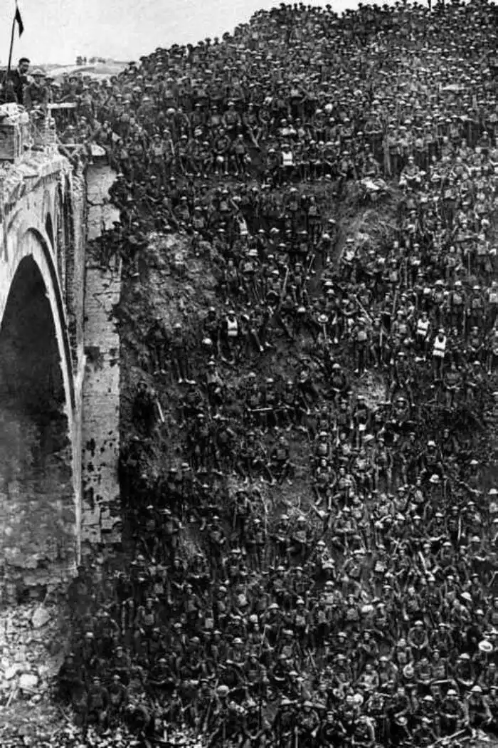 Бригадный генерал И. В. Кэмпбелл (на мостике) поздравляет солдат 46-й дивизии (Северный Мидленд) в Рикевале после успешного пересечения канала Сен-Квентин