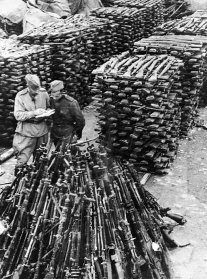 Советские солдаты составляют опись немецкого оружия, оставшегося после окончания Второй мировой