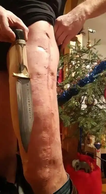 28-летний мотоциклист Морено Скварча после аварии, в буквальном смысле собрал себя по частям. Он сохранил осколки своей бедренной кости и с помощью друга сделал из них нож, точнее рукоять для него.