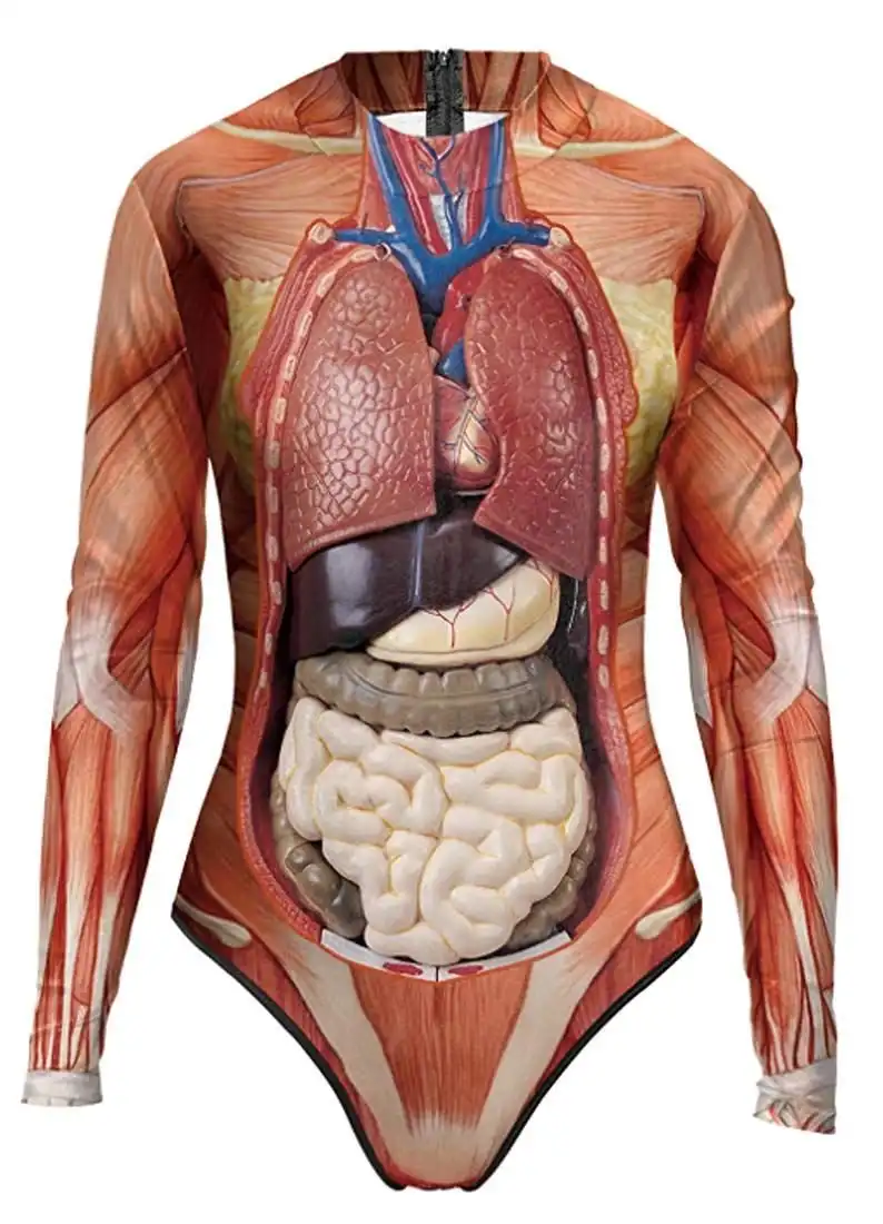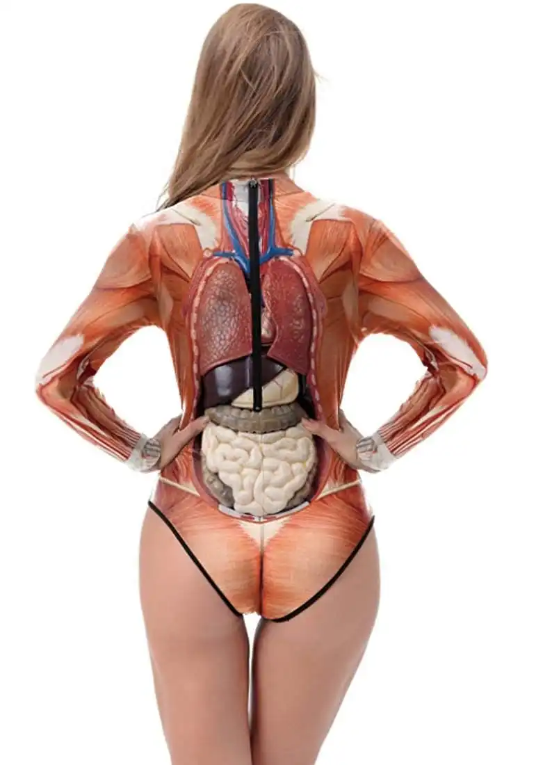 Рынок ка всегда чем то удивляет - цельный купальный костюм с длинными рукавами, на котором изображены внутренние органы, мышцы, артерии и вены, как спереди, так и сзади. Неудивительно, если барышню в таком купальнике попросят одеться.