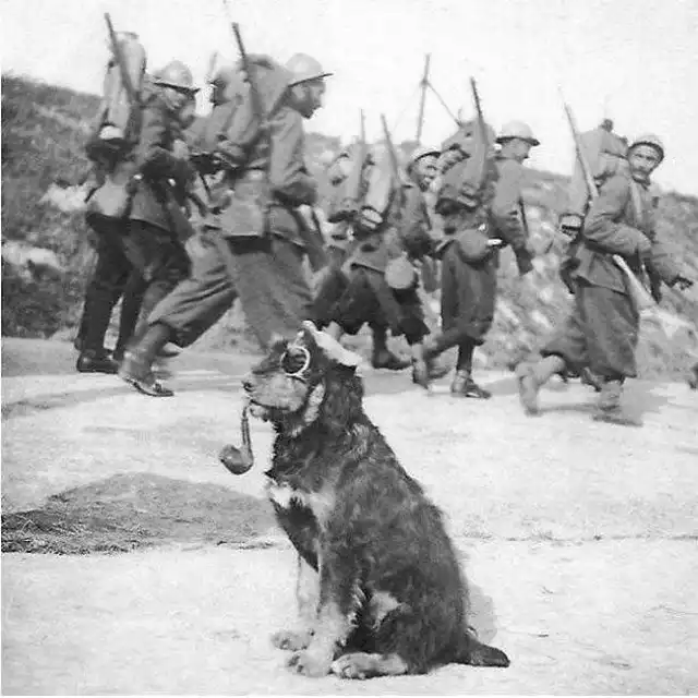 Французские войска маршируют мимо собаки со спортивными очками и трубкой, 1915
