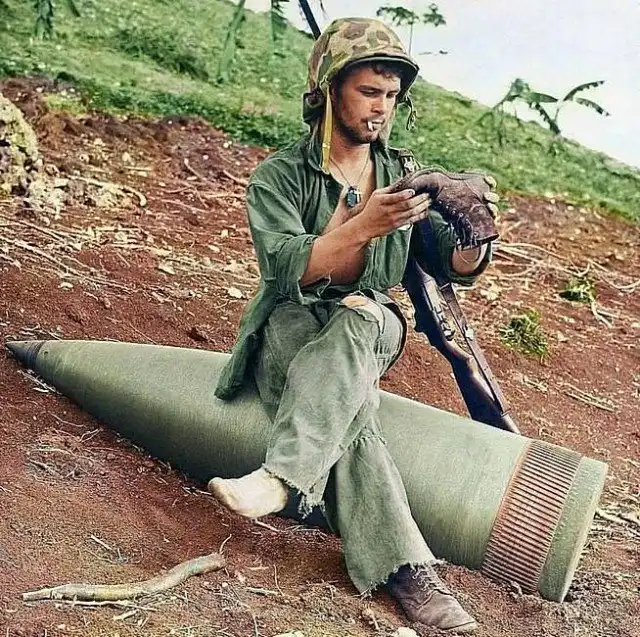 Американский морской пехотинец чистит сапоги, битва на Сайпане, июнь 1944 г