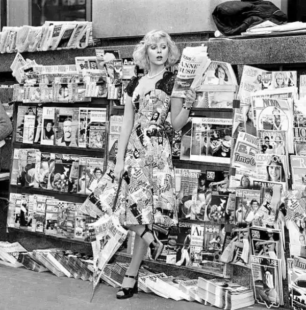 Модель в платье с газетным узором 1974