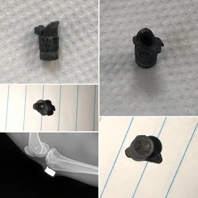 5. "Я работаю ветеринаром и недавно я извлек из кошки этот металлический предмет. На кости нет следов от удара.
