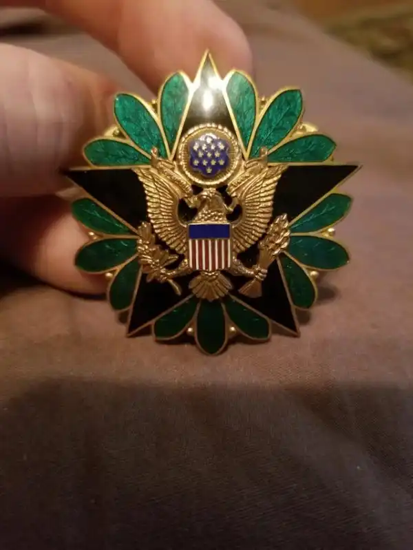 Это Опознавательный знак штаба армии. Конкретно эту брошь носили американские военные, служившие в канцелярии секретаря армии и штабе армии в штаб-квартире Департамента армии (HQDA) и его агентства. Брошь не является наградой и украшением.