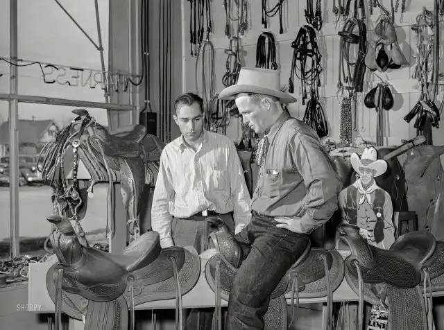 Ковбой подбирает себе седло в Элко, штат Невада. Март 1940 года.