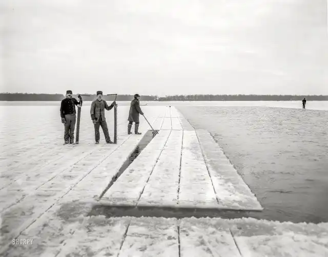 Заготовка льда на водохранилище Хорн Понд, штат Массачусетс, 1906 год.