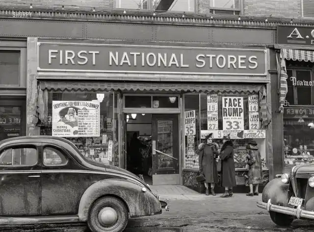 Витрина продуктового магазина в Бате, штат Мэн. Декабрь 1940 года.