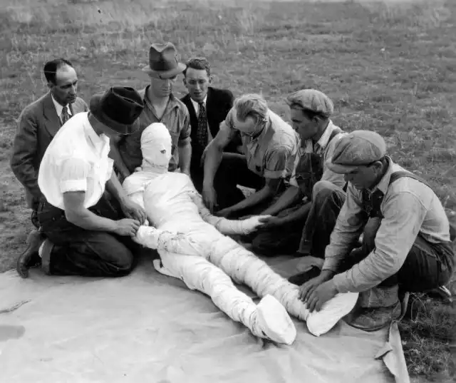 Тренировка по оказанию первой помощи и наложению бинтов в случае ожогов всего тела. Спрингфилд, 1930-е годы.