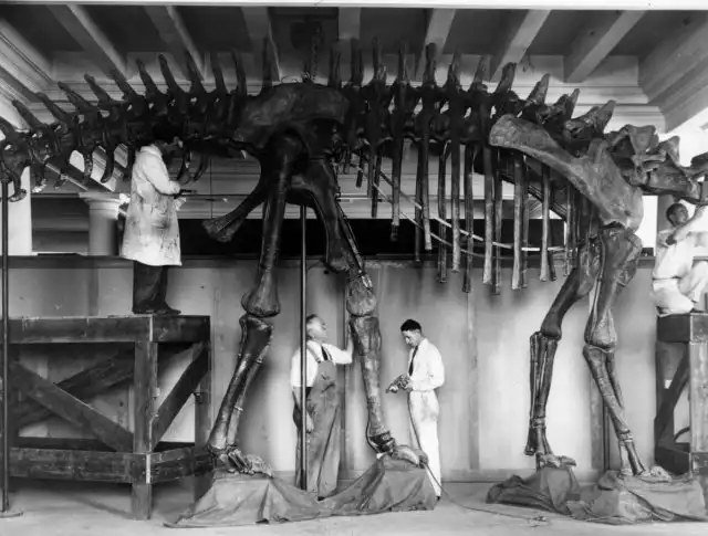 Сотрудники денверского музея естественной истории устанавливают скелет динозавра, 1935 год.