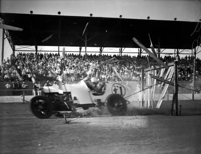 Американская гонщица Эльфрида Маис пробивает деревянную стену на своём автомобиле во время выполнения трюка на стадионе в Нью-Йорке, 1933 год.