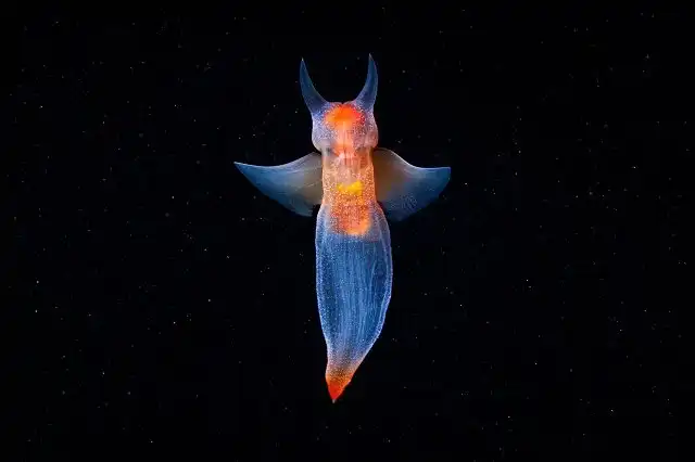 Так выглядит моллюск без раковины, подвид называется "голая морская бабочка". Так она выглядит в естественной среде обитания: