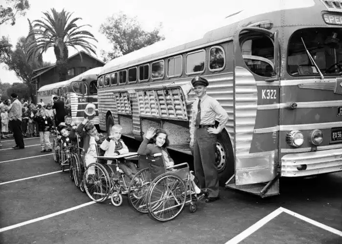 Лос-анджелесские дети в инвалидных колясках готовятся к отъезду в летний лагерь, 11 июля 1955 года