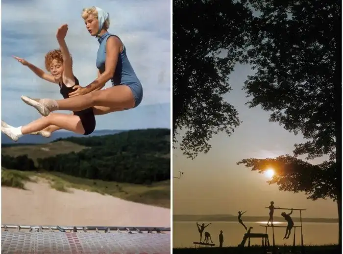 Занятия гимнастикой на берегу озера Элк в Вильямсбурге, штат Мичиган, 1956 г.