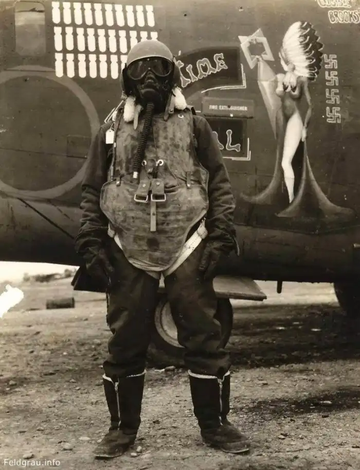 17. Летчик бомбардировщика B-24H Liberator "TePee Time Gal" майор Дэвид Бельмере в защитном обмундировании. Италия, 1944-45. На пилоте одето все что позволит выжить на высоте 25 000 футов.