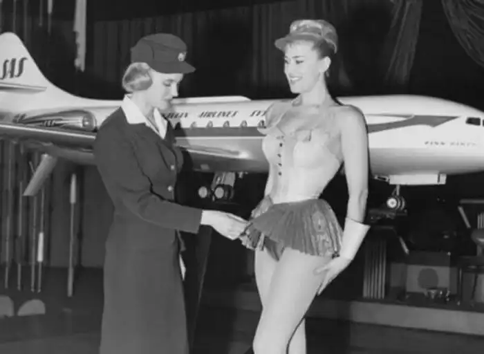 30. 1959. Стюардесса Бриггита Линдман присматривается к костюму "show girl" после того, что стюардессам авиокомании САС сообщили о том, что их форму укоротят.