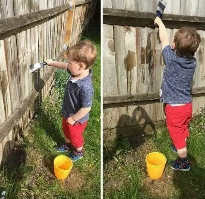6. "Мой сын хотел помочь красить забор, но он мог бы весь вымазаться в краске, поэтому мы дали ему ведро с водой и кисточку"