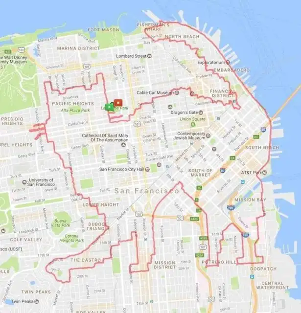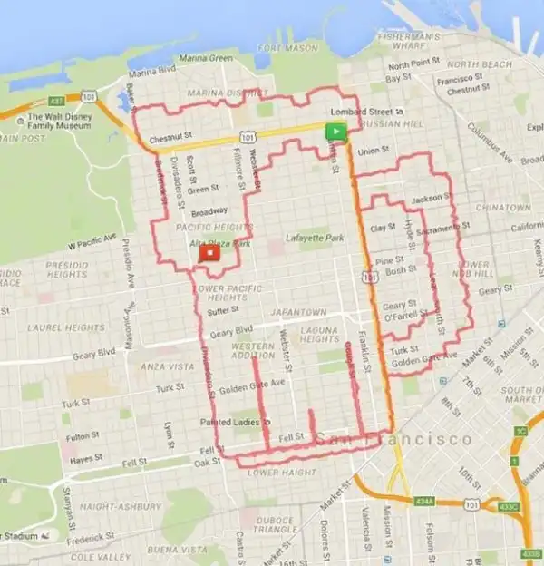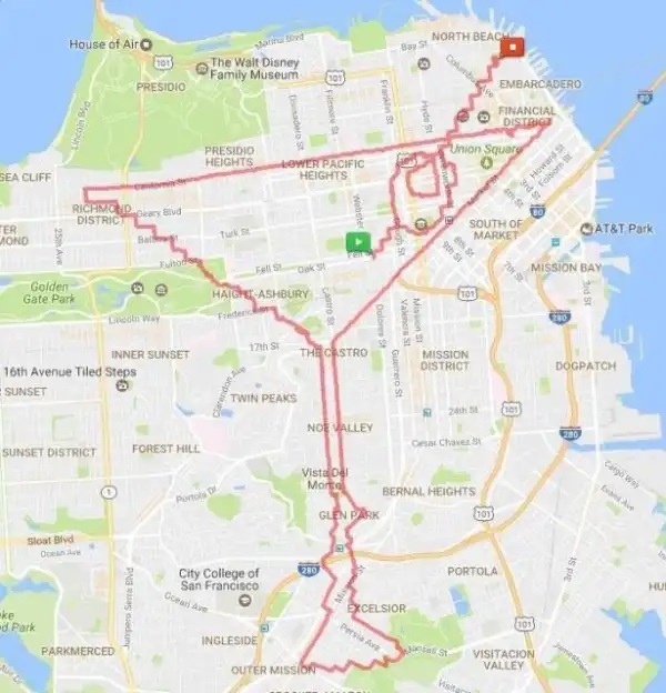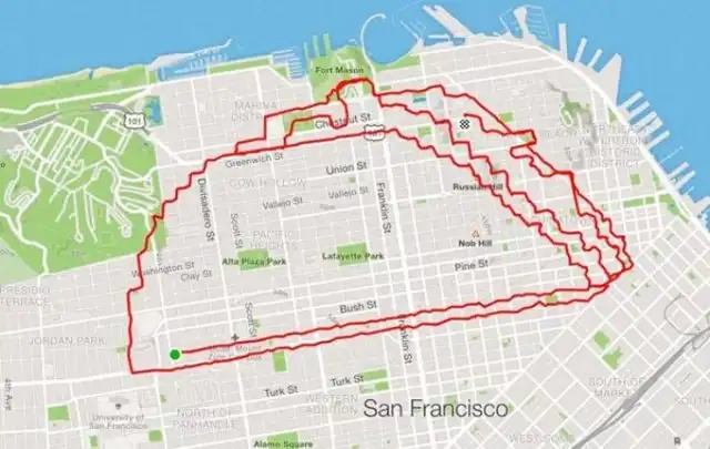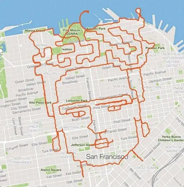 Что делать, если ты любишь пробежки по городу, да и в душе ты самый настоящий художник? Как все это совместить? Ленни Морган нашел выход. С помощью своего фитнес-трекера он "рисует" на картах Сан-Франциско, прокладывая путь своих тренировок. Получаются причудливые картины. И для здоровья полезно, и контент для блога появляется. В коллекции уже 53 рисунка.