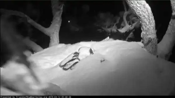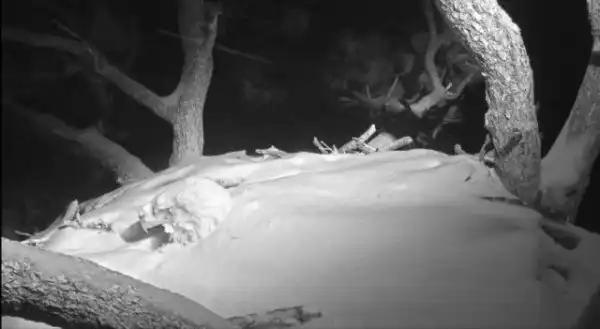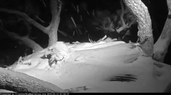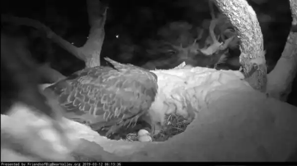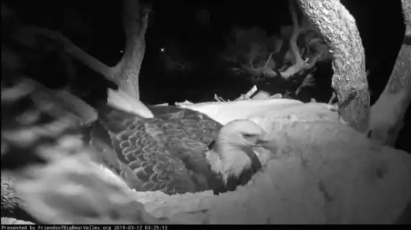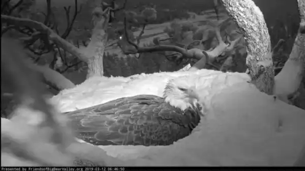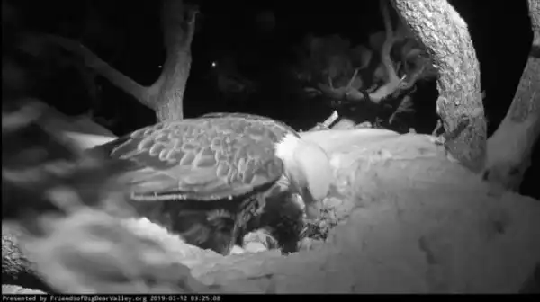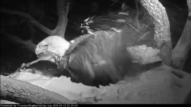 На самом деле это самка белоголового орлана, которая согревает свое будущее потомство во время снежной бури.