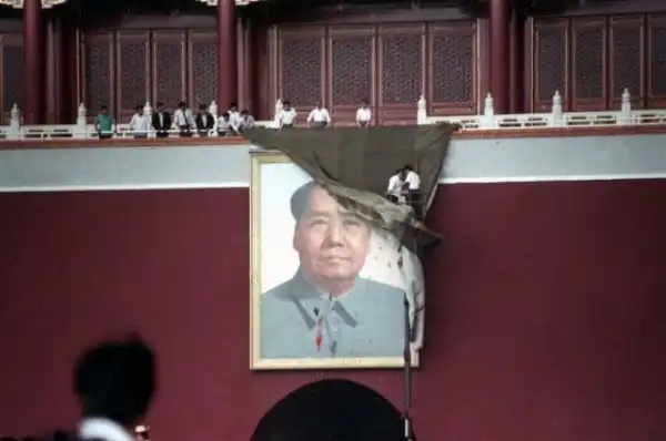 Портрет МАО закрывают от студентов, швыряющимися яйцами наполненными краской, площадь Тяньаньмэнь, Пекин, 23 мая 1989