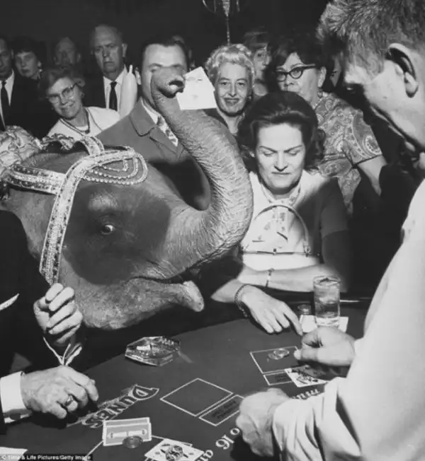 Таня, сиамский слон, выступавшая в отеле-казино Dunes в Лас-Вегасе, играет в блэкджек, 1966