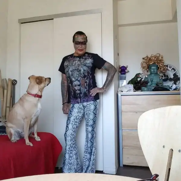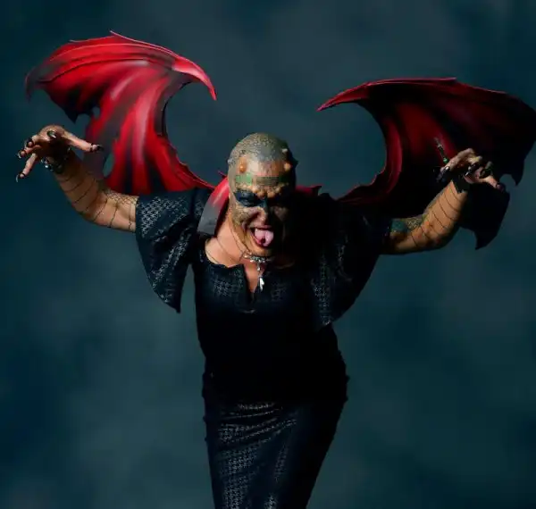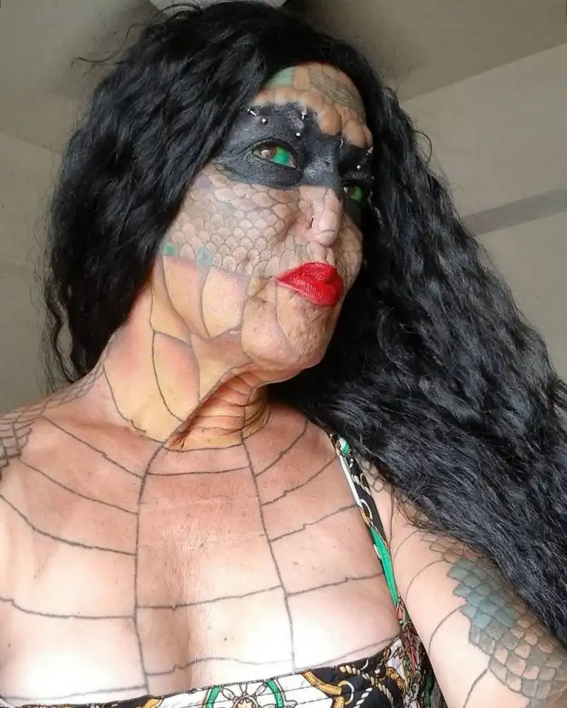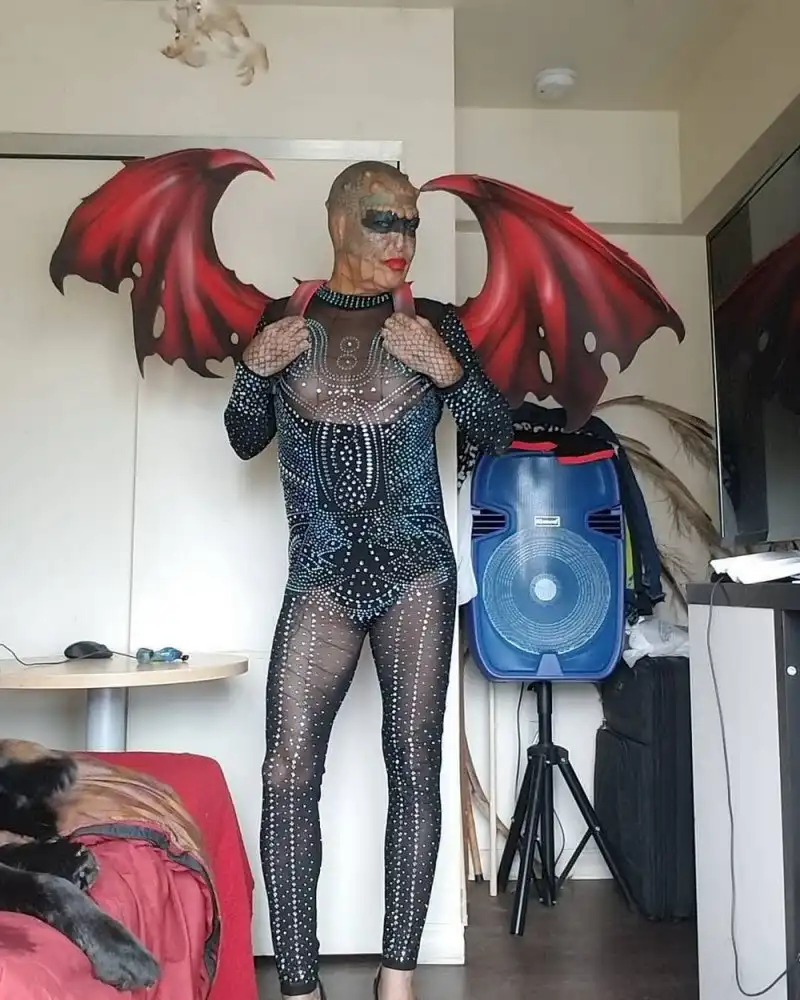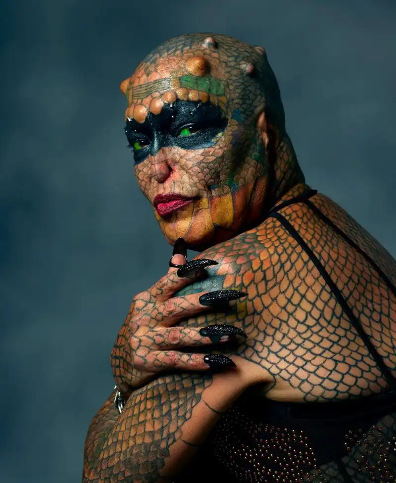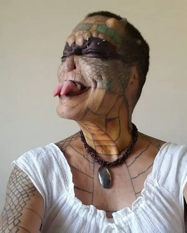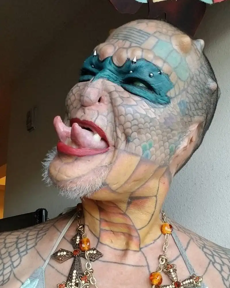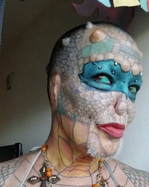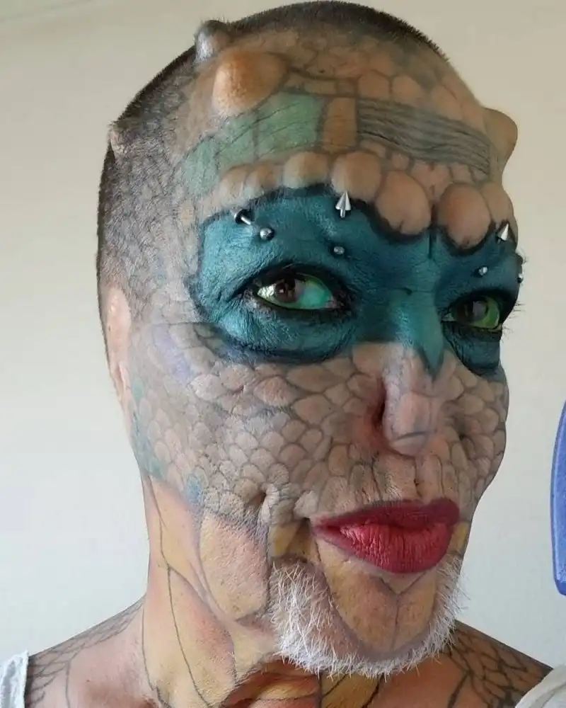 Он перенес 20 процедур по изменения тела и идентифицирует себя как трансвидовую рептилию. За последние два десятилетия Ричард подвергся кастрации, удалению ушей, носа, расщеплению языка и вставил 18 роговых имплантатов. Существо просит называть его “оно”, а в социальных сетях имеет ник Tiamat Dragon Lady. Изменения Ричард начал после постановки диагноза СПИД в 1997 году, но сейчас оно, вроде, полностью выздоровело.