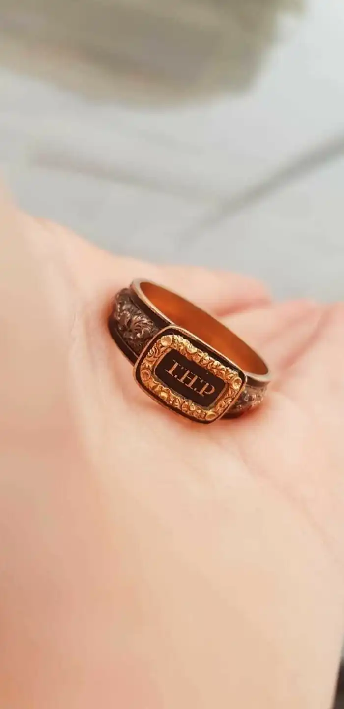 Ответ: георгианское/ранневикторианское траурное кольцо. Инициалы принадлежат умершему возлюбленному. Такие кольца, как правило, изготовлены из золота (18k+) и украшены черной эмалью. Данное изделие, вероятно, сделано в 1820-40-х годах.