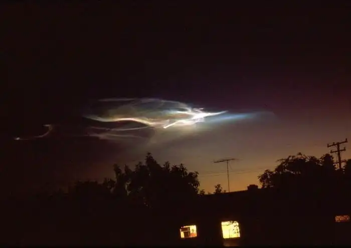Ответ: свечение от запущенной ракеты. На закате солнце осветило след выхлопных газов.
