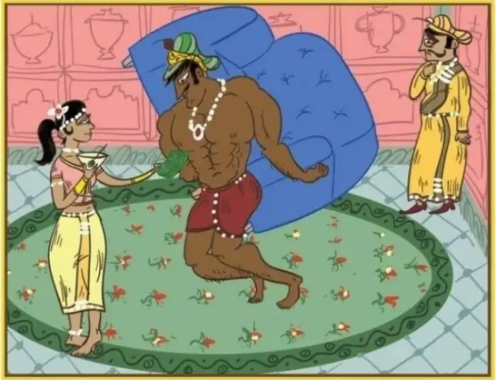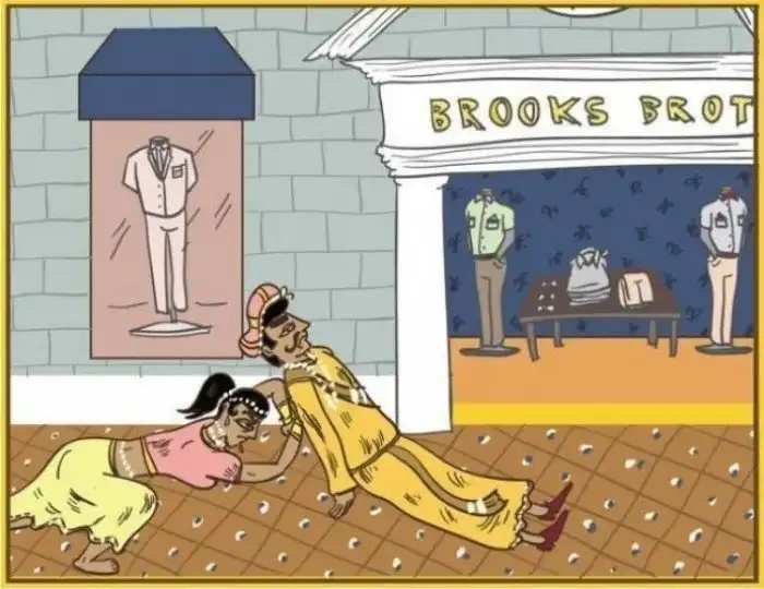 Женщина призывно склоняется к ногам мужа, чтобы вымести мусор. Тем самым она пытается побудить его к помощи с уборкой.