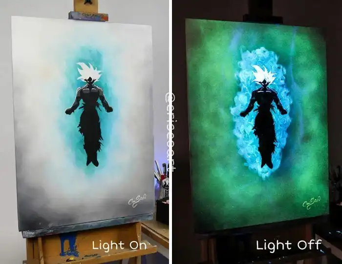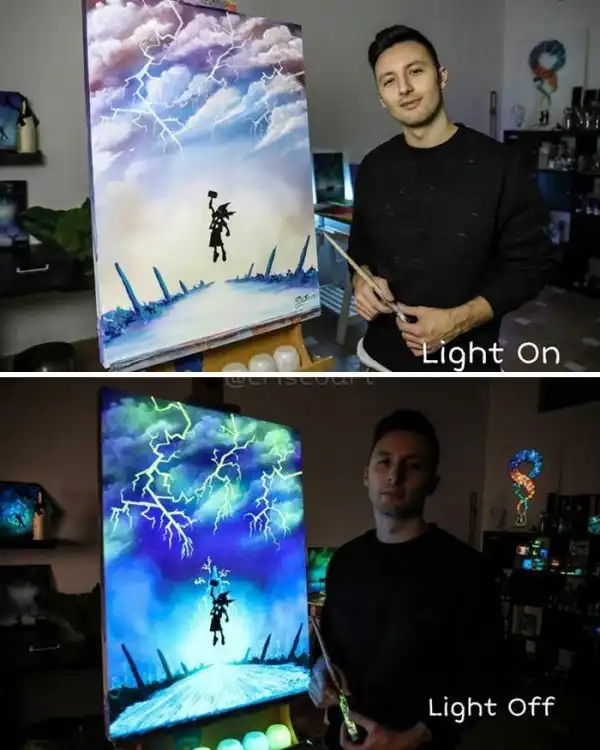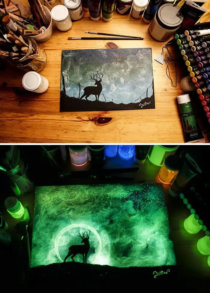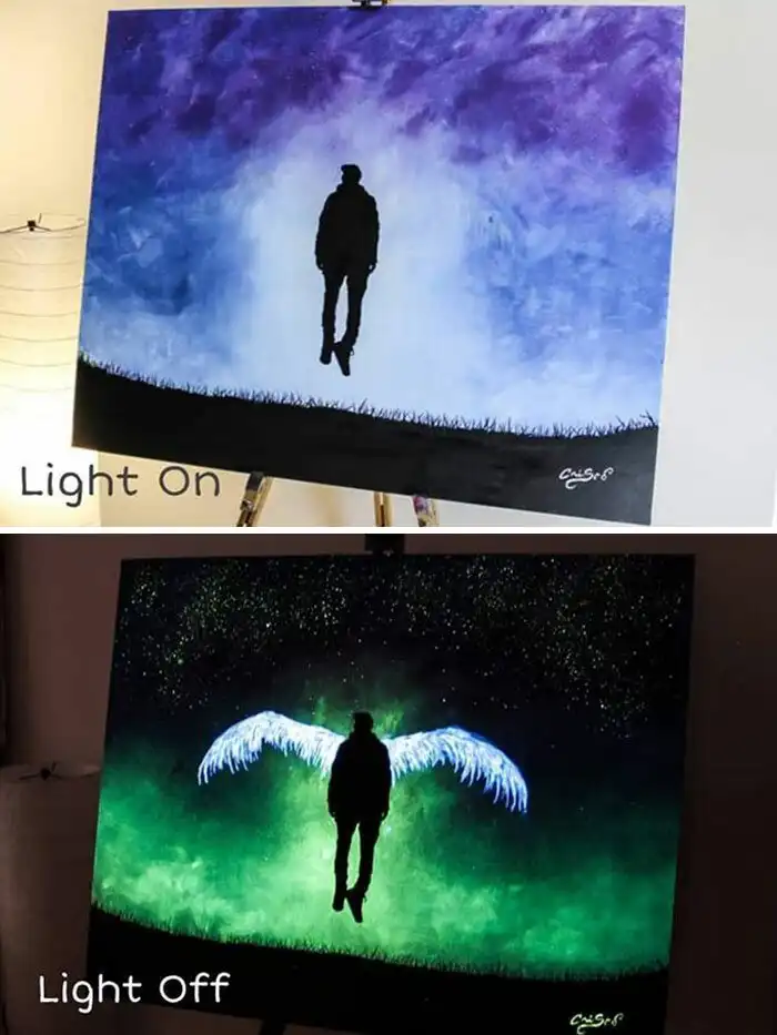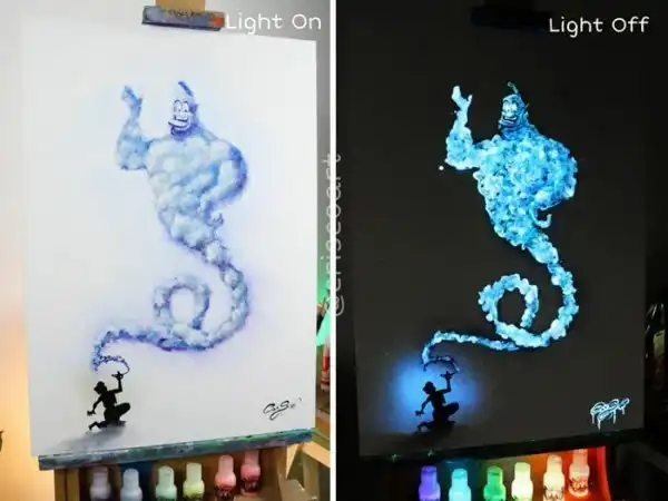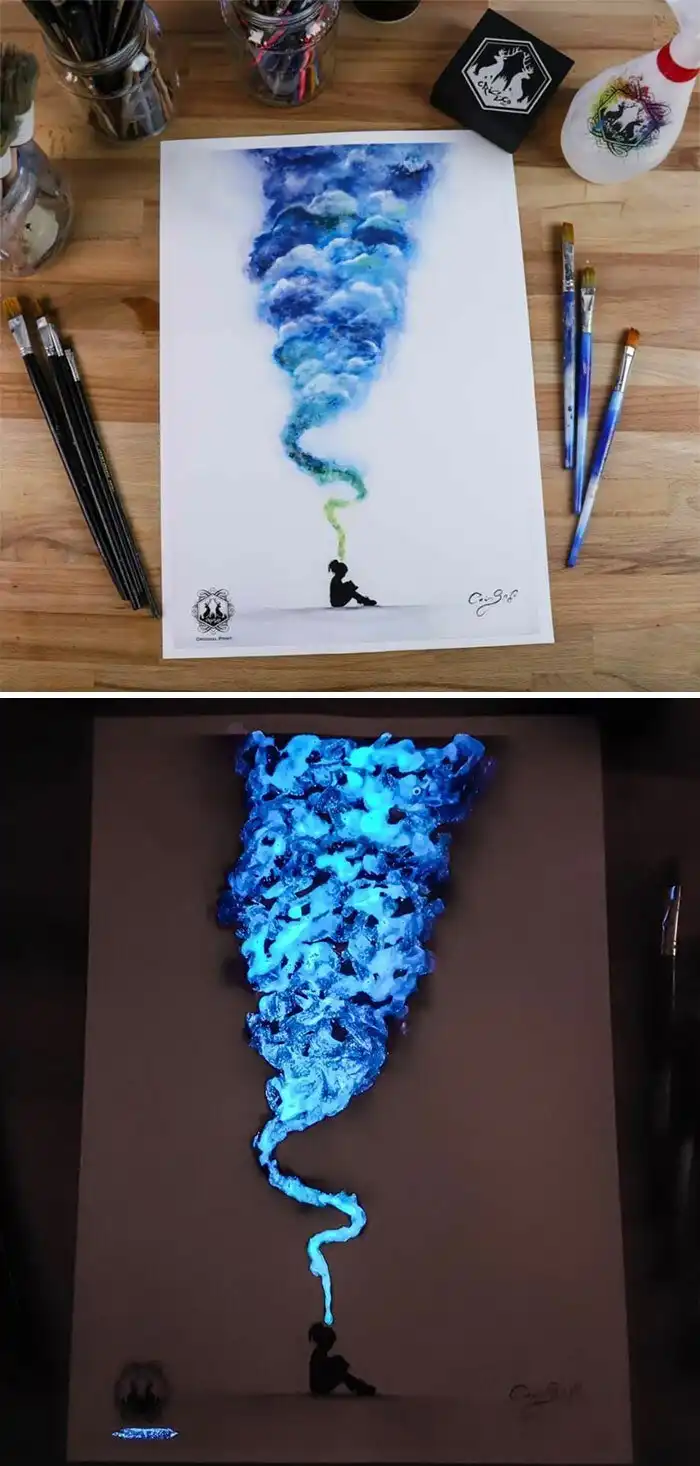 Итальянский художник-самоучка Кристофоро Скорпинити, известный под псевдонимом Crisco Art, уже несколько лет пишет картины с "двойным дном". Они рассказывают зрителю две истории: при свете дня - одну, а в темноте - другую. Так Crisco Art создает собственный волшебный мир, а помогают ему в этом фантазия и люминесцентные краски.