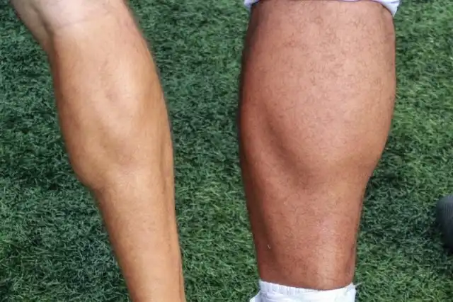 14. Икры регбистов. Слева - нога игрока весом 160 фунтов, справа - 360 (72 и 163 кг)