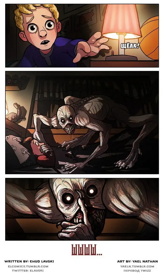 Для того, чтобы пощекотать себе нервишки, совершенно необязательно смотреть двухчасовой фильм ужасов или читать Кинга. Получить неслабую порцию мурашек можно всего за пару минут, просмотрев работы иллюстратора Яэль Натан, которая, сотрудничая с писателем Эхудом Лавски, создаёт воистину устрашающие и атмосферные серии комиксов. Готовы почувствовать, как вас охватывает ужас? Тогда вперёд!