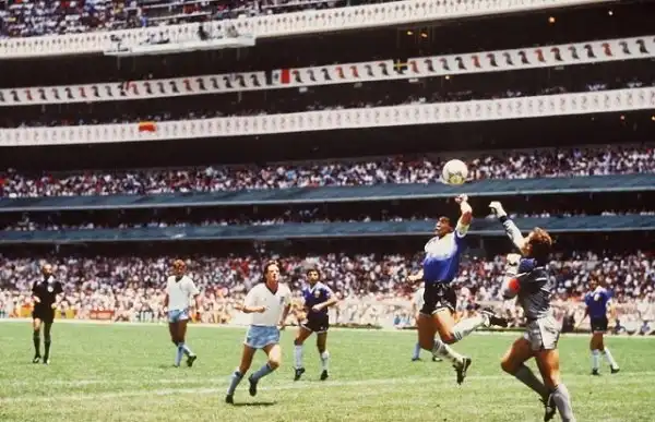 В матче против сборной Англии Диего Марадона забил мяч в ворота рукой, а судья посчитал, что головой. Так Аргентина смогла победить Англию со счетом 2:1. Сам Диего заявил, что это была не иначе как рука Бога, а не он.