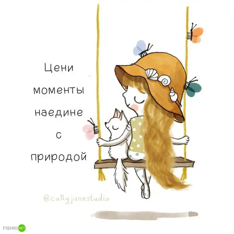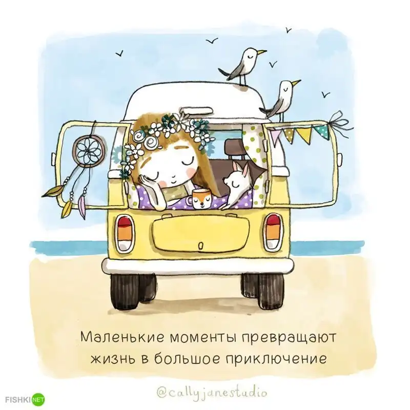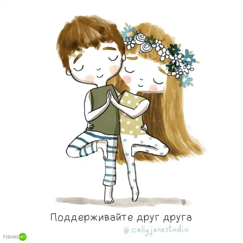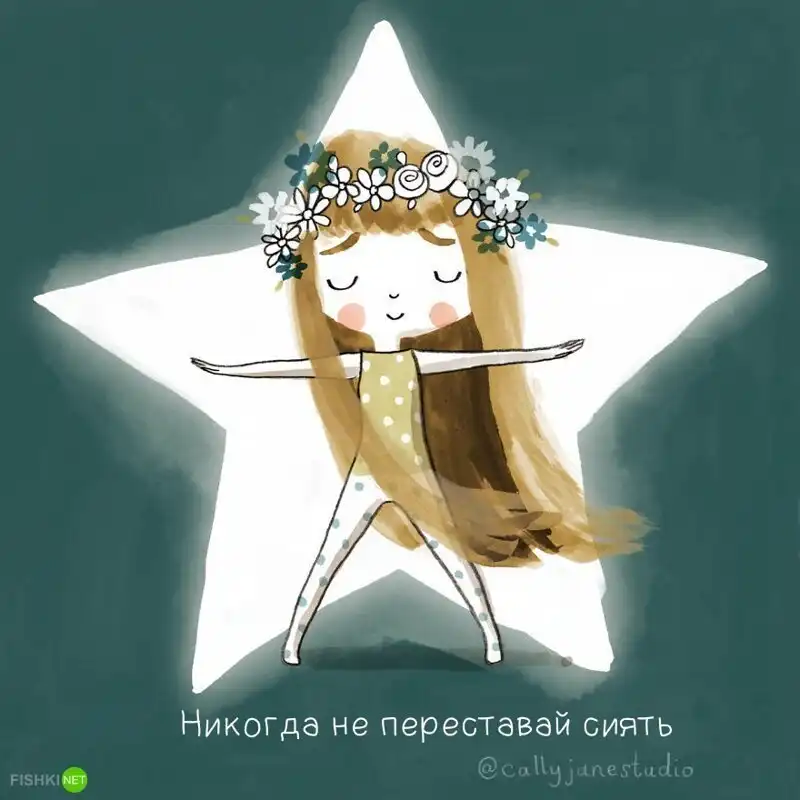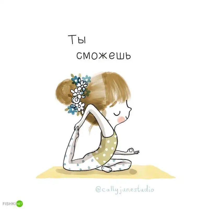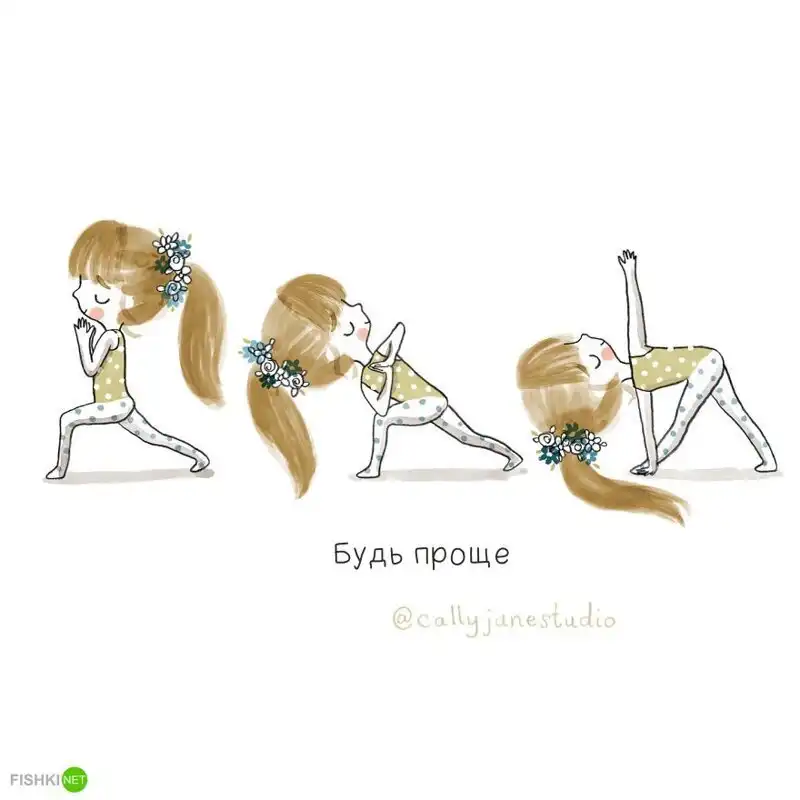 Британская художница и иллюстратор детских книг по имени Калли (Cally) обожает свою работу. В свободное время она занимается йогой, и рисует удивительные мини-комиксы с участием своей маленькой музы. Героиня ее рисунков - девушка, которая любит йогу и находит счастье и вдохновение в каждом дне. Как же нам иногда не хватает такого простого вдохновения в ежедневной суете..