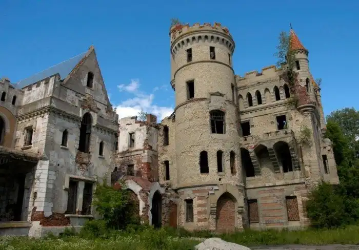 Усадьба Строгановых «Красная горка», Псковская область. Главный дом усадьбы был построен в 70-80-х годах XIX века. После революции имение было превращено в районную больницу. Во время войны большинство построек усадьбы было разрушено.