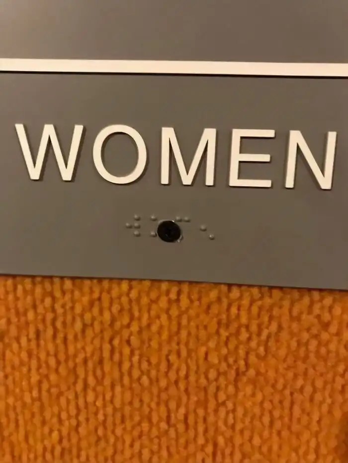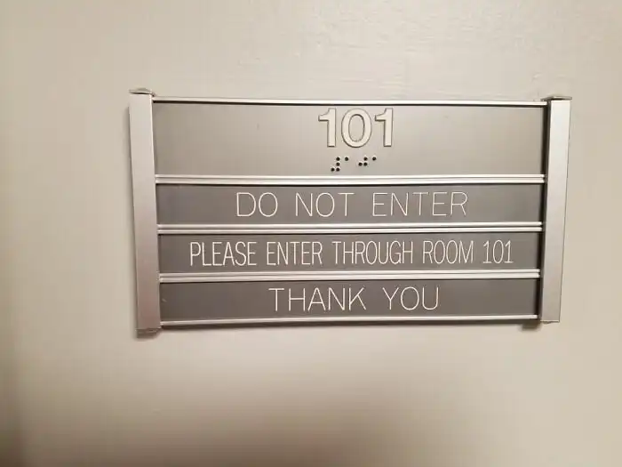 16. "Комната 101. Не входить. Проходить через комнату 101. Спасибо" - кажется, то, что Брайль здесь только на номере комнаты, не единственная проблема этого знака..